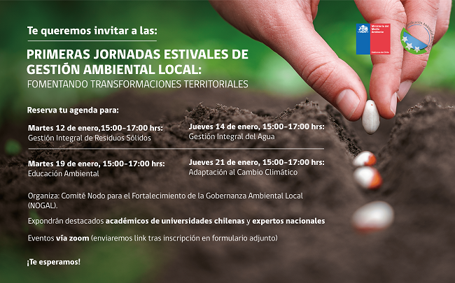 La Unidad de Vinculación con el mundo Público y Social de la Vicerrectoría de Vinculación con el Medio, invita a las Jornadas estivales de gestión ambiental local: fomentando transformaciones territoriales, que se desarrollarán los días 12, 14, 19 y 21 de enero 2021 entre 15:00 y 17:00 hrs, organizadas por el Nodo de fortalecimiento de Gobernanza Local Ambiental (NOGAL) conformado por el Ministerio del Medio Ambiente, Universidades, centros de investigación, organizaciones sociales, comunidades y asociaciones de municipios.