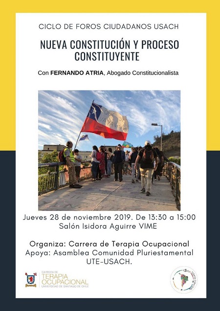 En el marco del Ciclo de Foros Ciudadanos USACH, la carrera de Terapia Ocupacional invita a ser parte de la jornada "Nueva Constitución y Proceso Constituyente", que contará con la participación del abogado constitucionalista Fernando Atria Lemaitre.