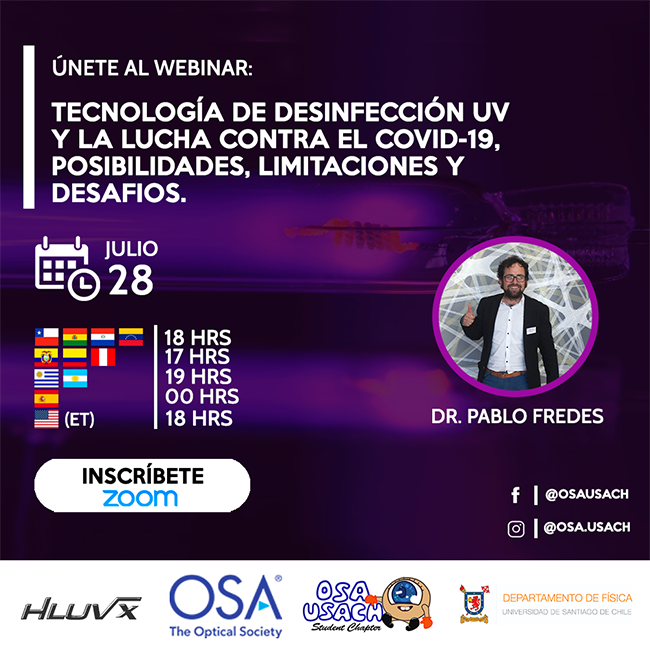 El grupo OSA USACH, dedicado a la divulgación científica y cuyo foco principal es la Óptica y Fotónica, invita al seminario web "Tecnología de desinfección UV y la lucha contra el #Covid_19", a realizarse el 28 de julio a las 18.00 horas.