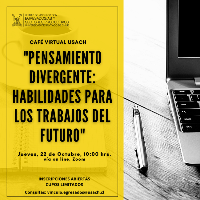 "Pensamiento Divergente: Habilidades para los trabajos del futuro", es el tema que abordaremos en la sesión que tendrá lugar el jueves 22 de octubre, a partir de las 10:00 hrs., vía Zoom.