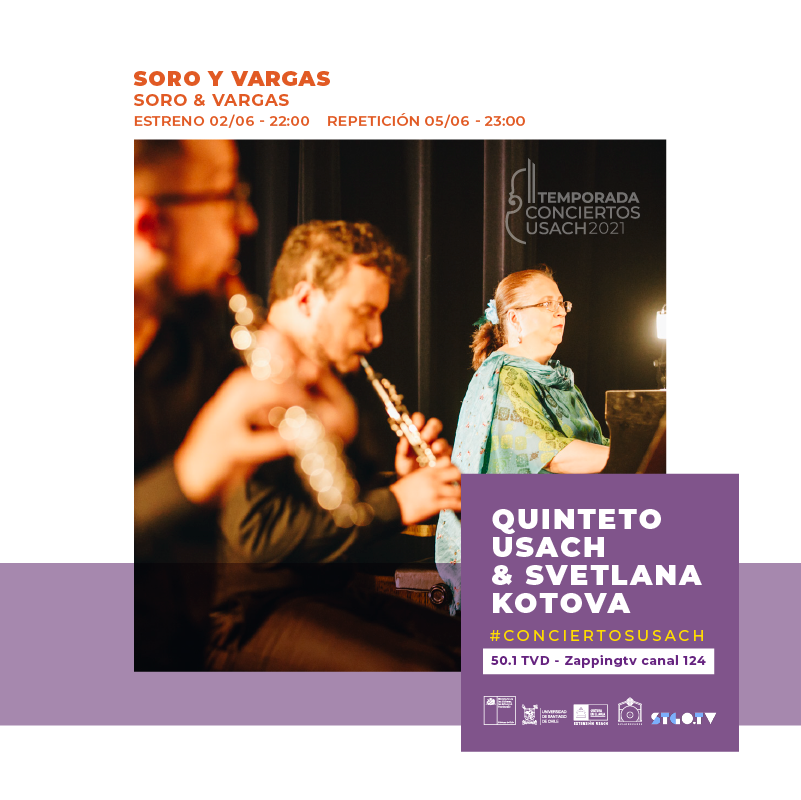 El Departamento de Extensión de la Vicerrectoría de Vinculación con el Medio le invita al concierto "Quinteto de Vientos Usach y Svetlana Kotova - Soro & Vargas". Se trata del tercer capítulo de la segunda temporada de Conciertos Usach, programa emitido por Stgo TV.
