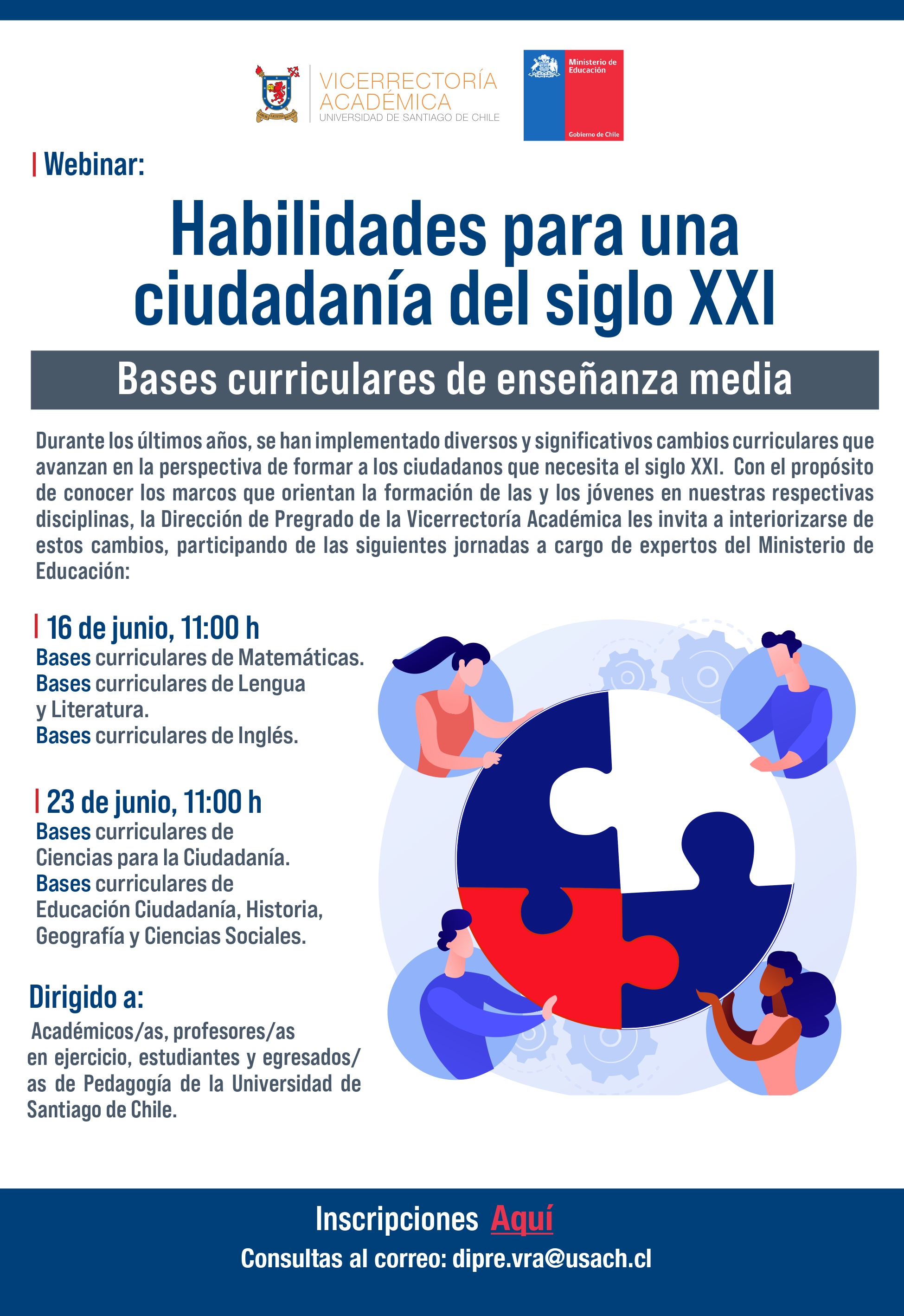 La Vicerrectoría Académica de la Universidad de Santiago y el Ministerio de Educación invitan a la comunidad a participar del ciclo de webinars "Habilidades para una ciudadanía del siglo XXI: Bases curriculares de enseñanza media".
