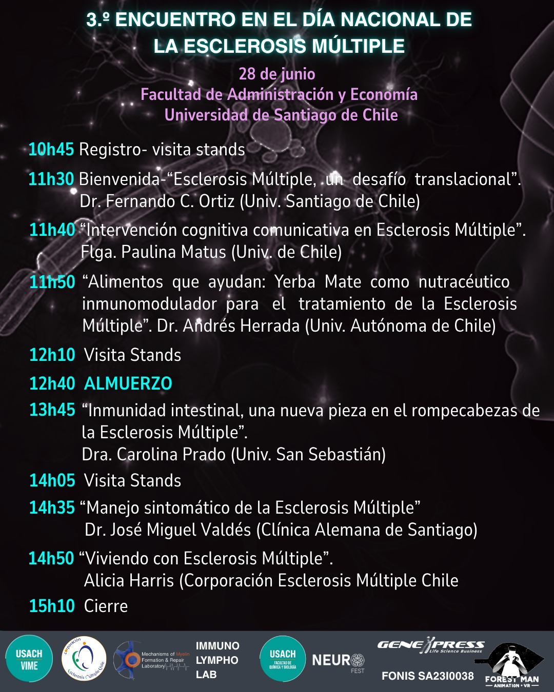 El Día Nacional de la Esclerosis Múltiple en Chile se conmemora el día 26 de junio. En esta fecha se busca visibilizar, concientizar y sensibilizar a la población sobre esta enfermedad, promoviendo la investigación y el desarrollo de nuevos tratamientos. Es por ello que la Universidad de Santiago de Chile, en su calidad de Universidad Estatal y Pública, comparte este compromiso y se propone abrir espacios para el diálogo entre el quehacer académico y las comunidades de personas con Esclerosis Múltiple y sus familias.