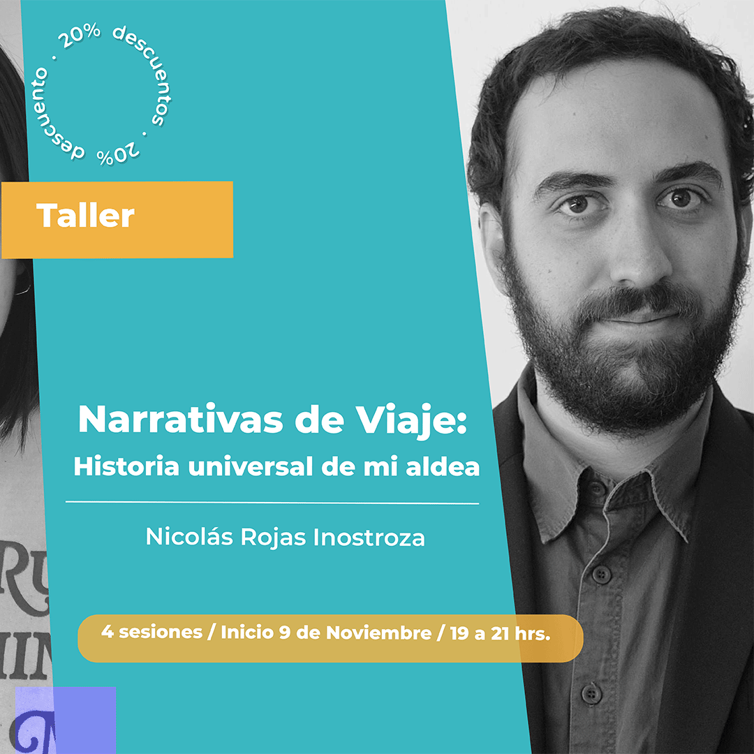 - Taller Narrativas de viaje: historia universal de mi aldea. Con Nicolás Rojas | Inicio: 9 de noviembre, 4 sesiones, de 19:00 a 21:00 horas.