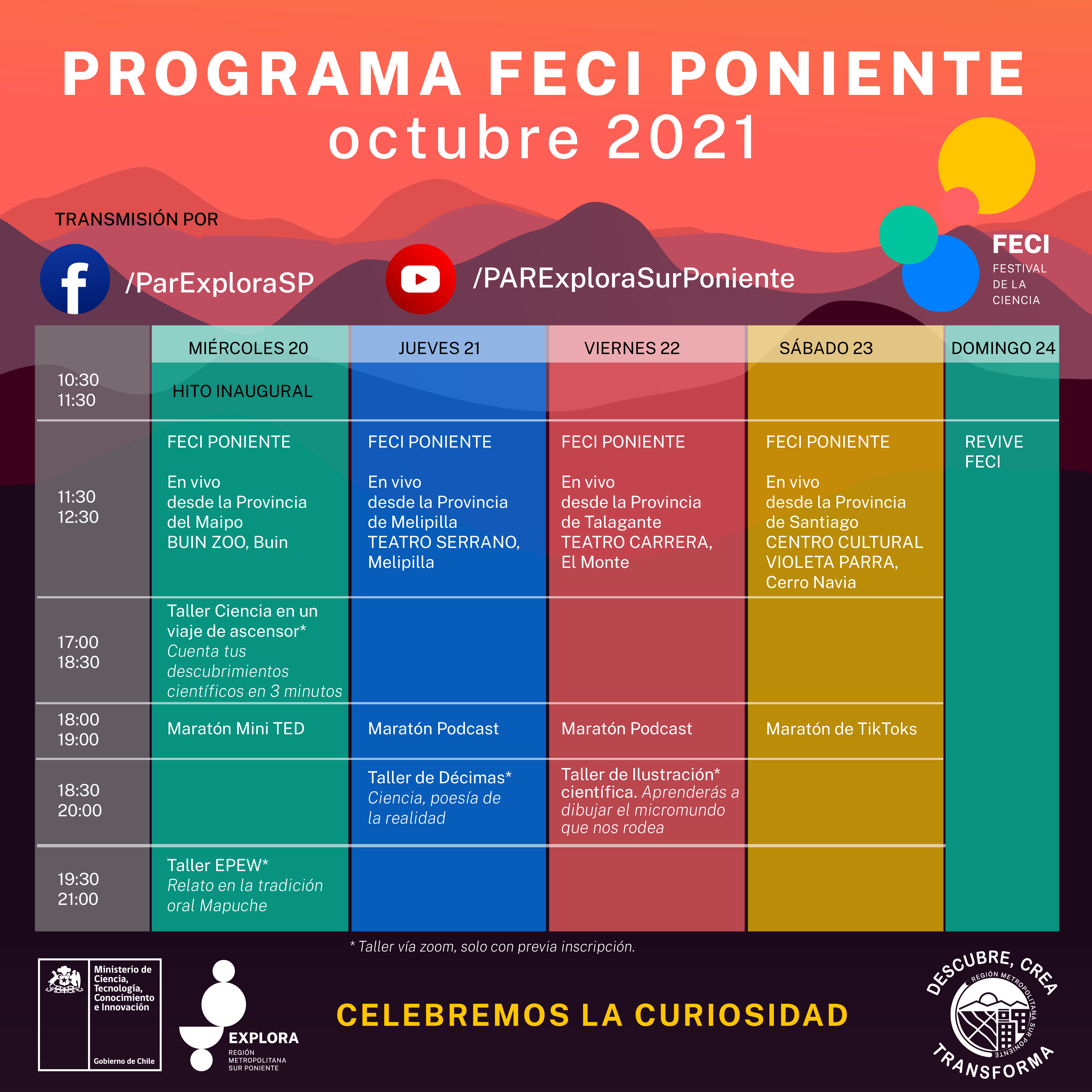 El Buin Zoo, los teatros Serrano de Melipilla y Carrera de El Monte y la Casa de la Cultura Violeta Parra de Cerro Navia serán los espacios desde donde se emitirá el programa de televisión que Explora RM Sur Poniente ha preparado para la versión de este año de FECI. Los días destinados para cada provincia son 20, 21, 22 y 23 respectivamente. El 24 de octubre será jornada de repetición de los productos.