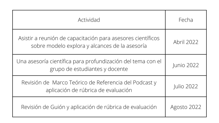 El/la asesor/a acompañará a un grupo de investigación escolar (estudiantes y profesor/a guía) durante el desarrollo de sus proyectos. El apoyo consiste en: realizar reuniones virtuales y/o presenciales con el equipo asignado, aconsejar para el apropiado desarrollo de los proyectos y velar por el cumplimiento de los lineamientos éticos y la rigurosidad científica.