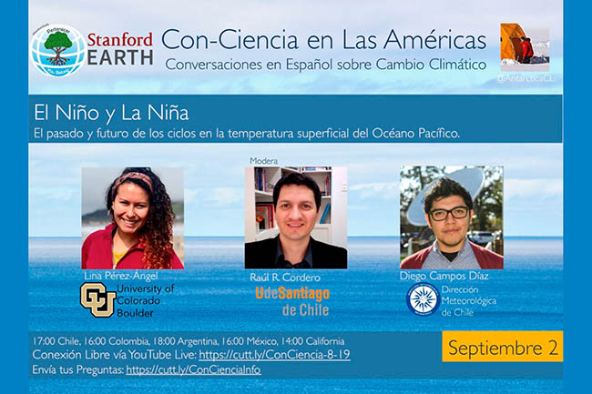Participarán como panelistas la investigadora de la Universidad de Colorado en Boulder, Lina Pérez-Ángel, y el meteorólogo de la Dirección Meteorológica de Chile (DMC), Diego Campos.