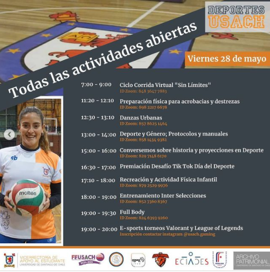 El Departamento de Gestión del Deporte y Cultura de la Vicerrectoría de Apoyo al Estudiante invita a la comunidad universitaria a participar de las diferentes actividades a realizarse en el marco del Día del Deporte Usach 2021, que se conmemorará los días jueves 27 y viernes 28 de mayo.