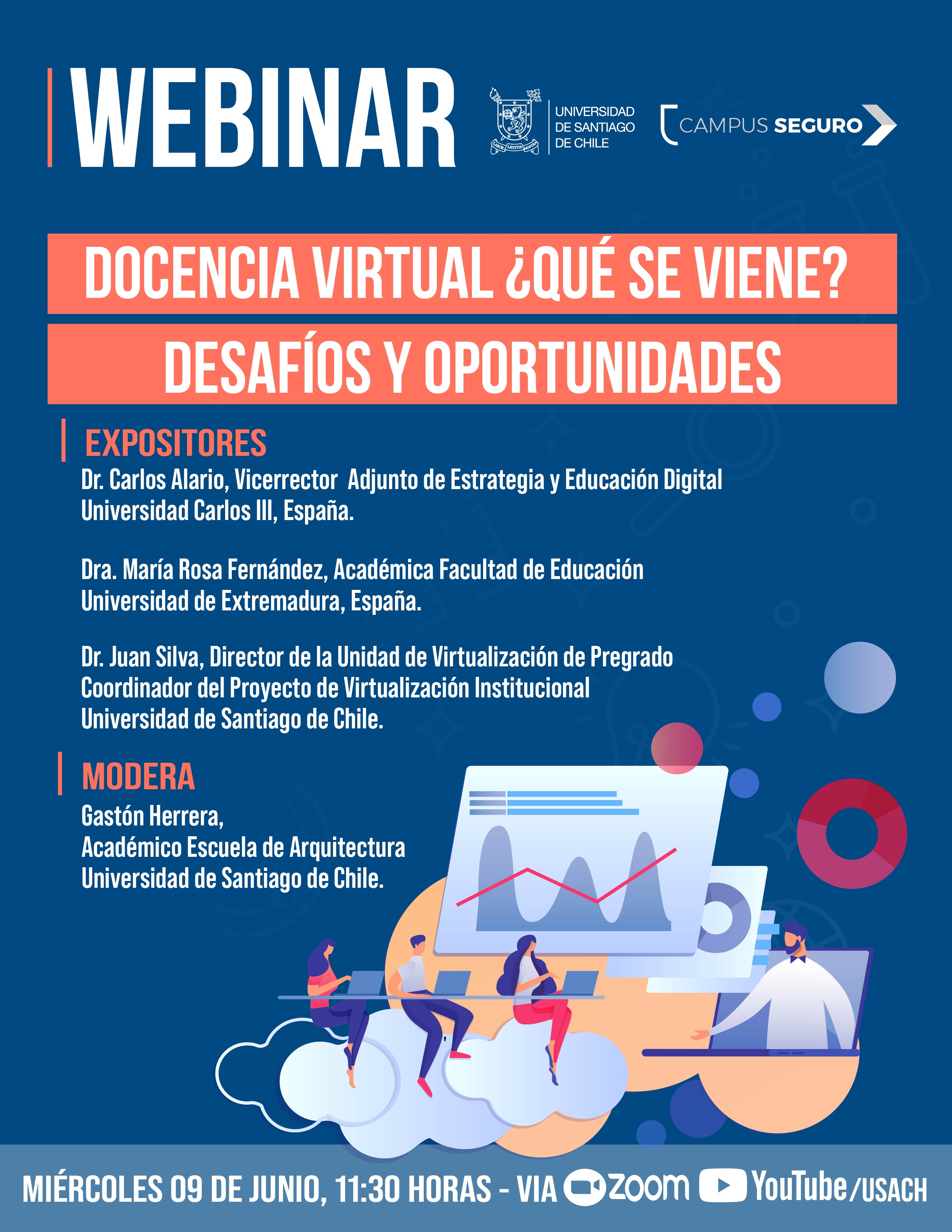 La Prorrectoría de la Universidad de Santiago de Chile, junto a las y los integrantes del Comité Campus Seguro, le invitan al webinar “Docencia Virtual ¿qué se viene?: desafíos y oportunidades", a realizarse el miércoles 9 de junio a las 11:30 horas. Se trata de la quinta jornada del ciclo de seminarios Campus Seguro, orientado a abordar temas relevantes para nuestra comunidad.