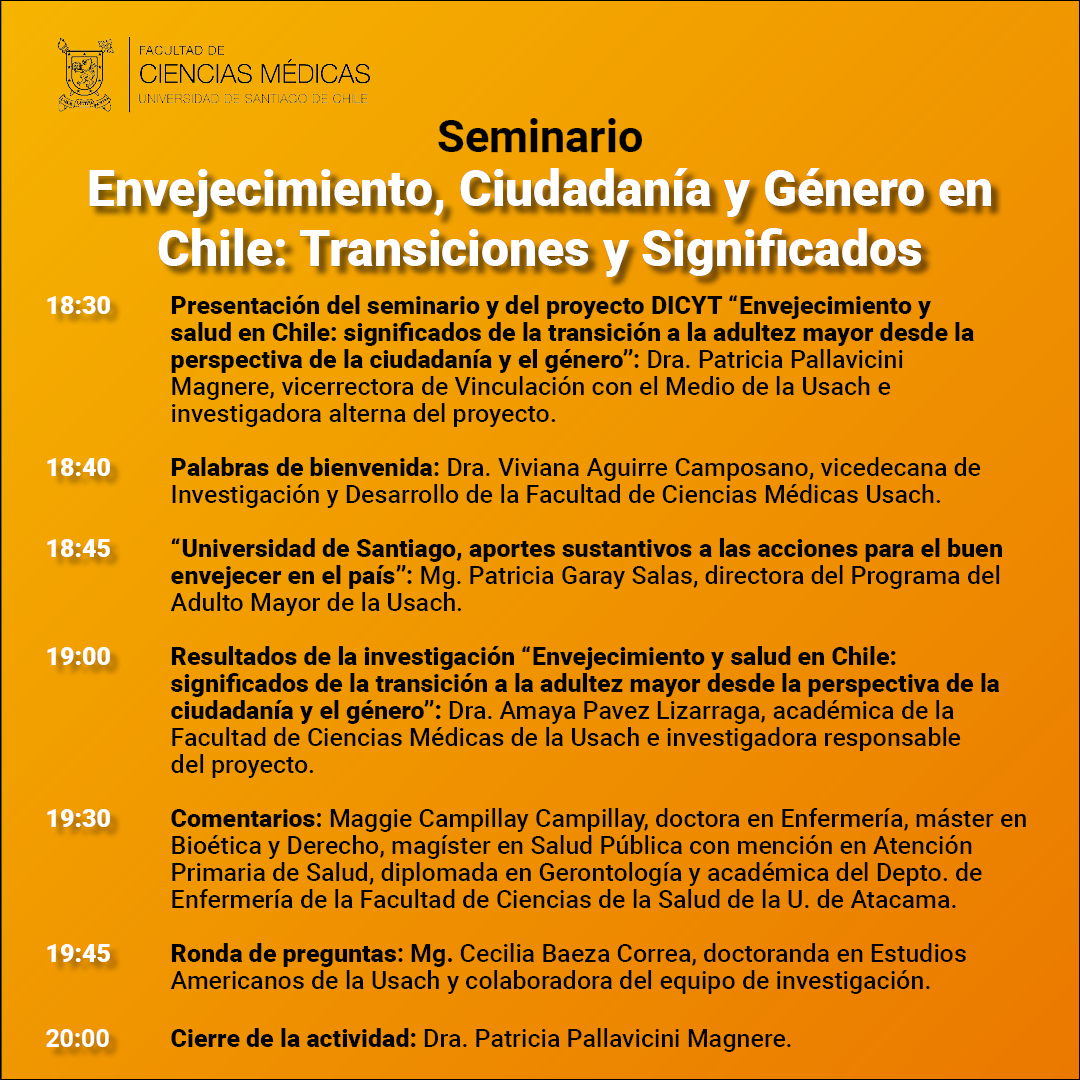 El seminario dará a conocer los resultados del proyecto DICYT “Envejecimiento y salud en Chile: significados de la transición a la adultez mayor desde la perspectiva de la ciudadanía y el género”, a cargo de la académica del Programa Centro de Salud Pública de la Facultad, Dra. Amaya Pavez Lizarraga, y en donde participó como investigadora alterna la vicerrectora de Vinculación con el Medio, Dra. Patricia Pallavicini Magnere.