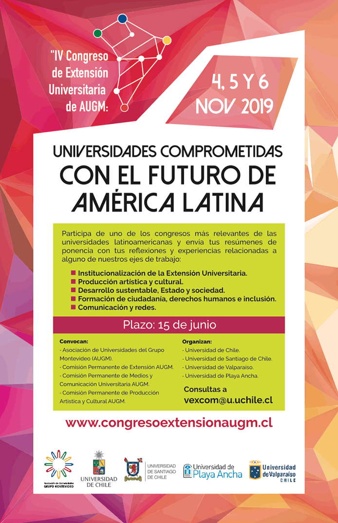 Chile será sede del IV Congreso de Extensión de la Asociación de Universidades Grupo Montevideo (AUGM) que se llevará adelante el 4, 5 y 6 de noviembre con el título “Universidades comprometidas con el futuro de América Latina”. Este encuentro apunta a abrir un espacio para comprender el contexto actual de la región y el rol de las universidades frente a los desafíos sociales y su aporte a los Objetivos de Desarrollo Sostenible.