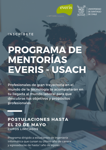 Atención estudiantes de último año y egresad@s hasta un año de titulación de Departamento de Ingeniería Informática - UdeSantiago. Participa del Programa de Mentorías EVERIS-USACH, una iniciativa conjunta entre nuestra Usach y la prestigiosa empresa everis Chile